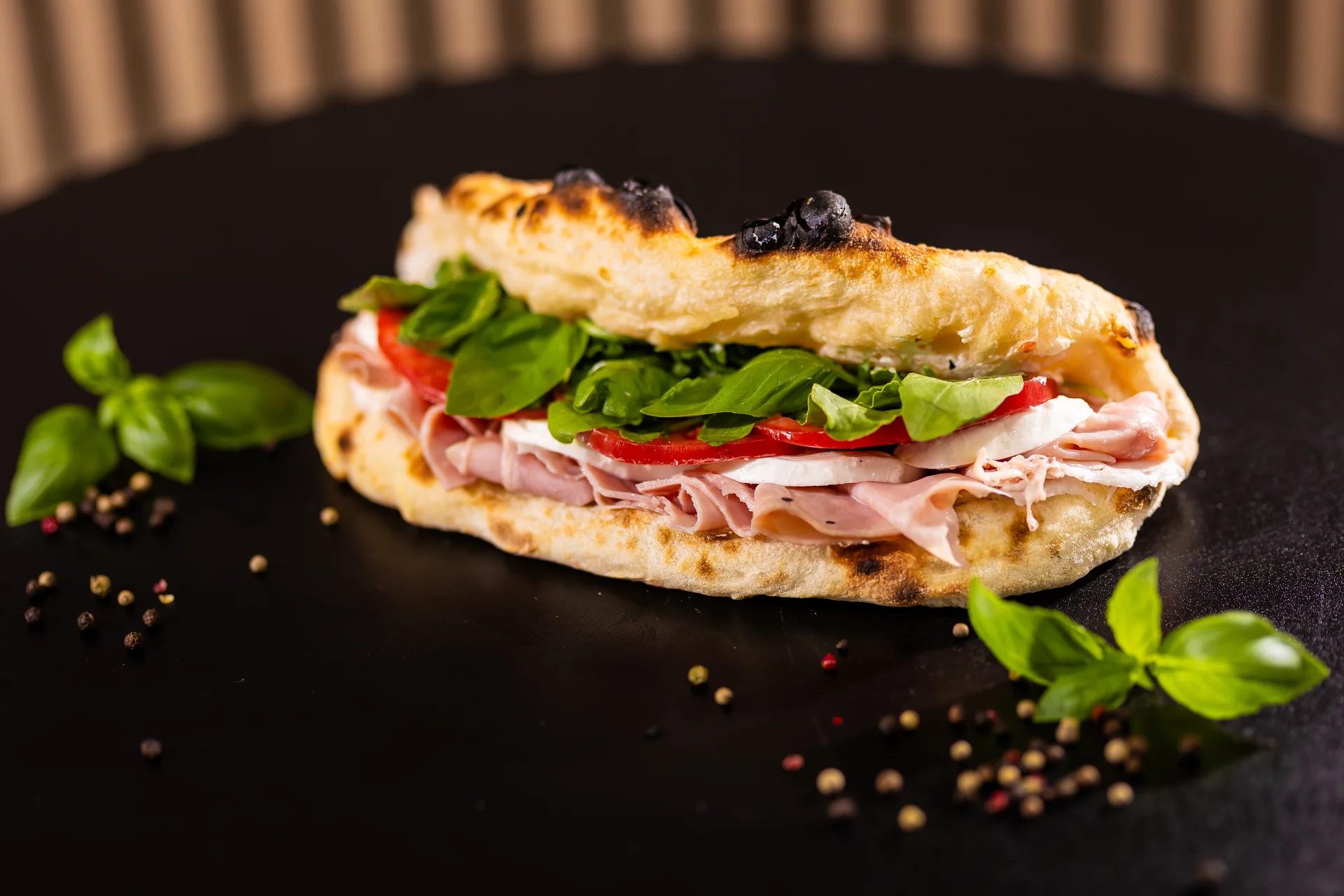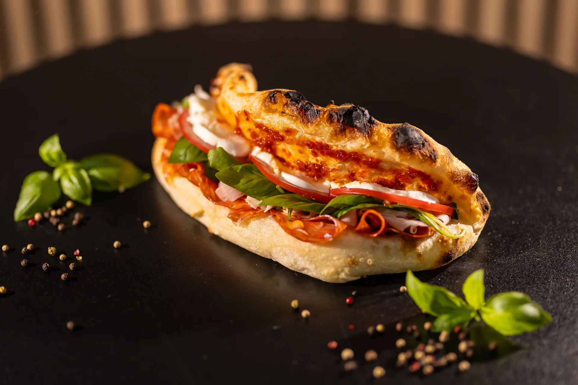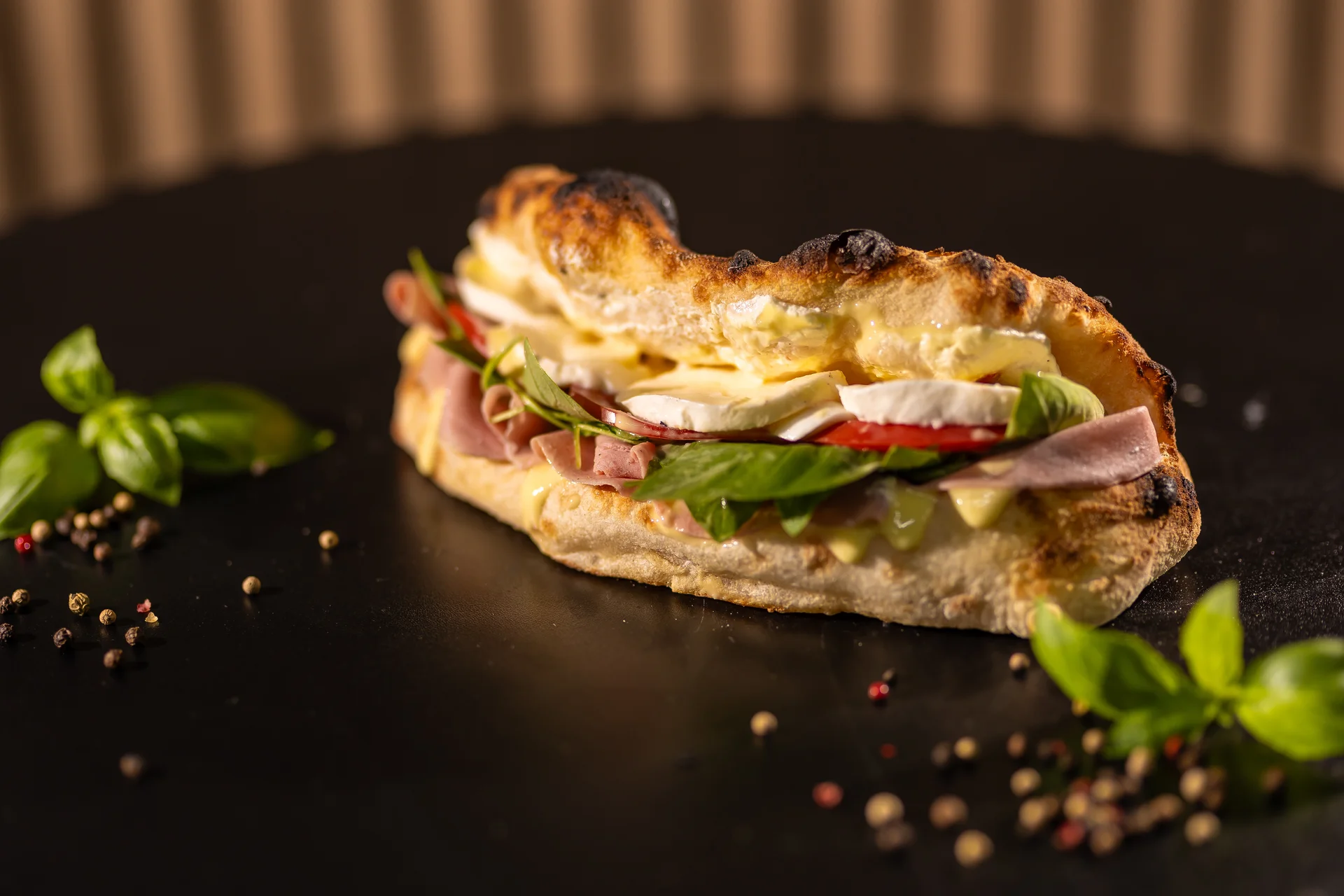 Aluat Napolitan, Mortadella, Mozzarella Fresca, Cremă de brânză, Roșii, Sos Franțuzesc, Rucolă