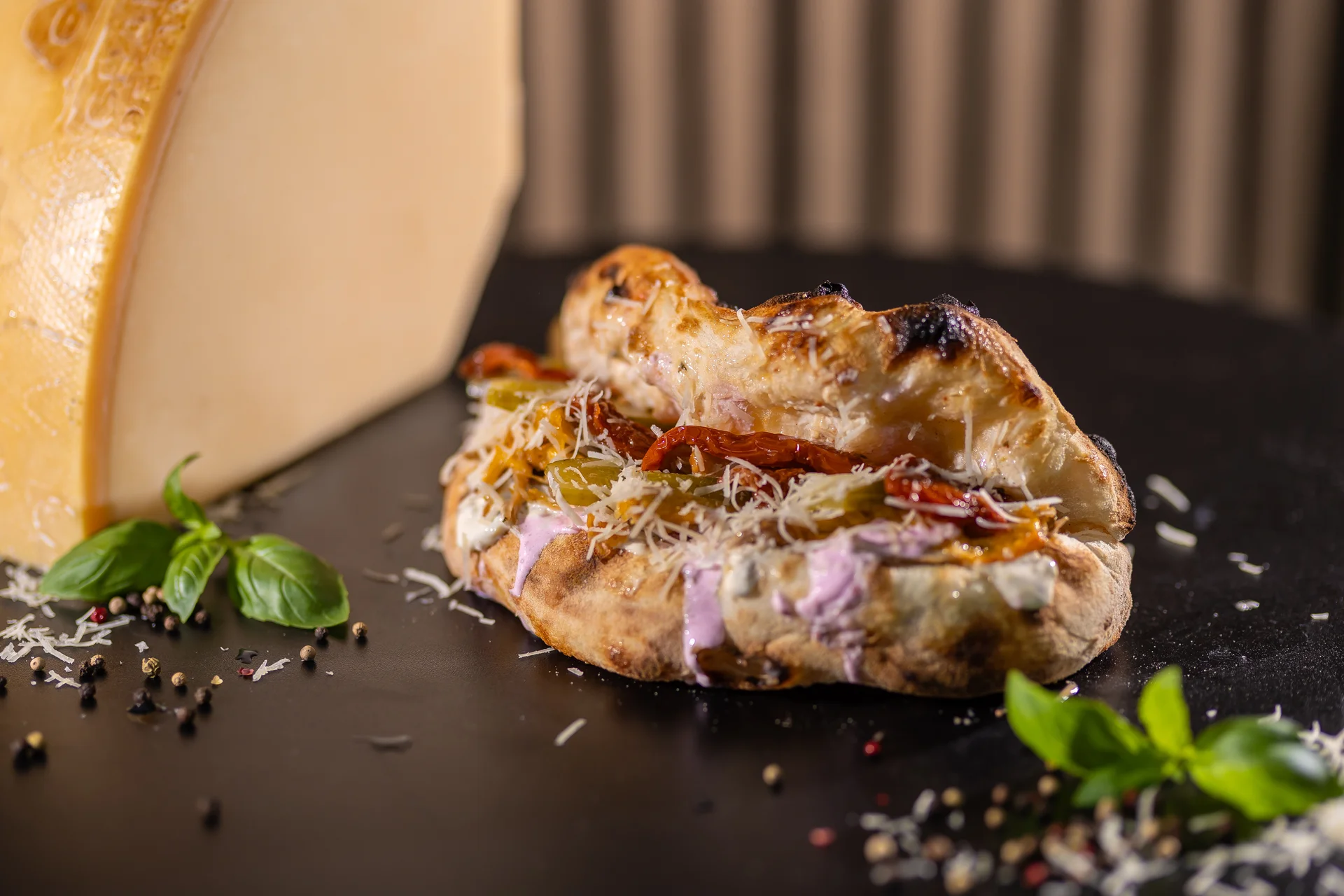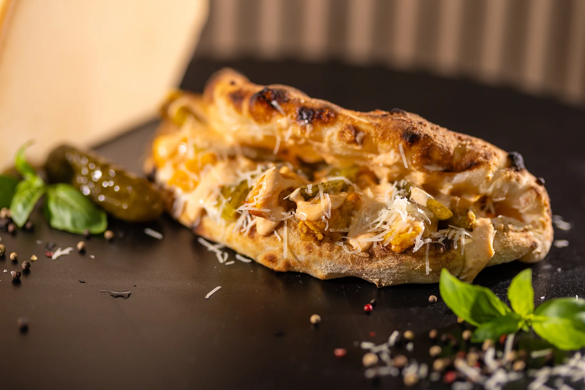 Aluat Napolitan, Crispy, Sos Cheddar, Cremă de brânză, Sos Fiteria, Castraveți murați, Parmezan Grana Padano