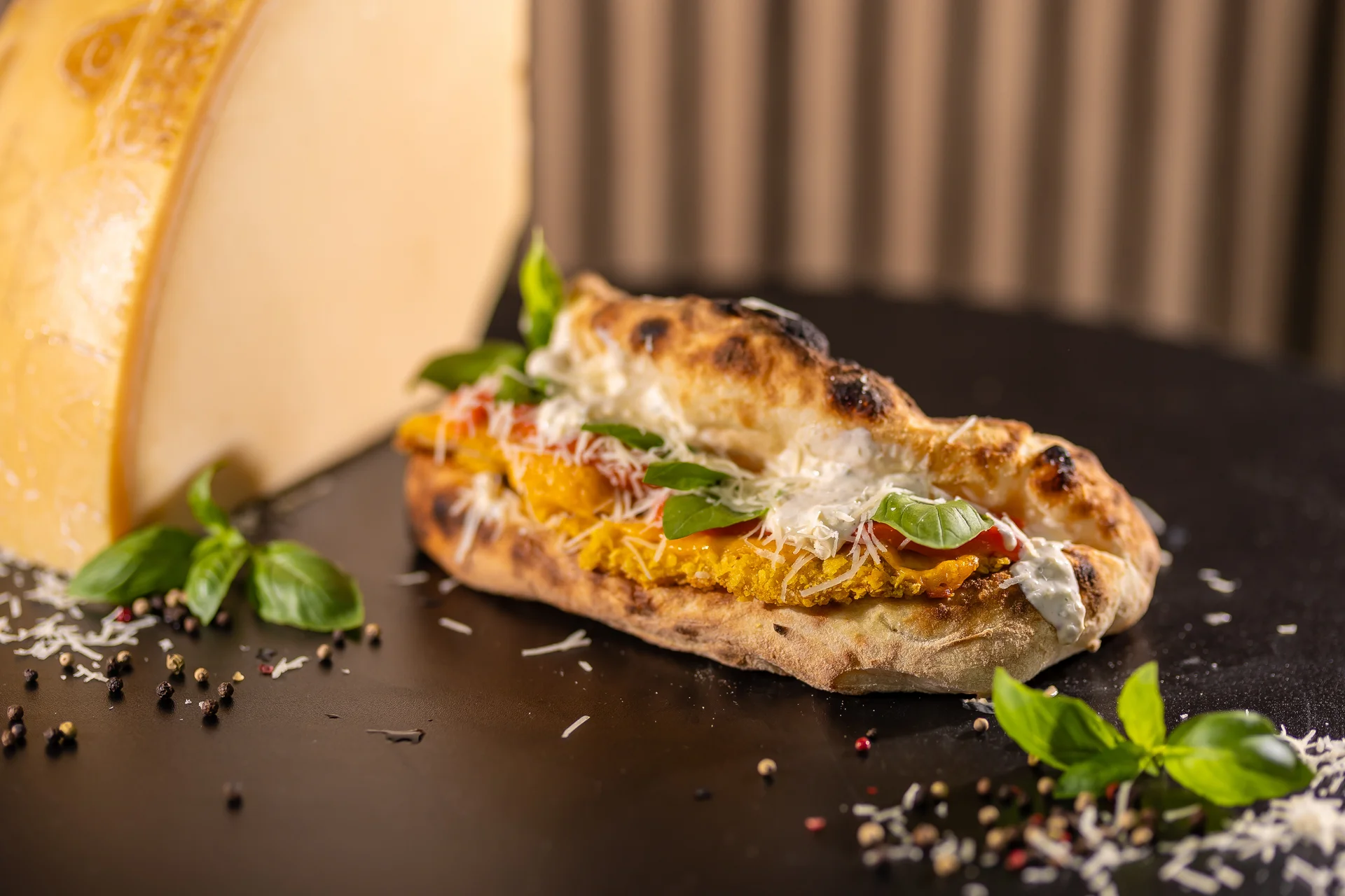 Aluat Napolitan, Șnițel Panko, Sos Napoli, Mozzarella, Grana Padano, Roșii uscate, Rucola, Busuioc